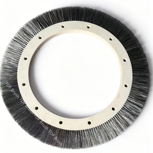 This steel wire brush wheel with integrated PVC core is a key accessory for textile dyeing, finishing and stenter machines, specially engineered for fabric edge pressing and anti-wrinkle positioning in dyeing & finishing processes. It features stable rotation, wear-resistant steel wire filaments and a corrosion-proof PVC core, perfectly matching mainstream stenter and textile printing equipment, with easy installation and long service life. Nylon and pig bristle versions are available for customization as required.
